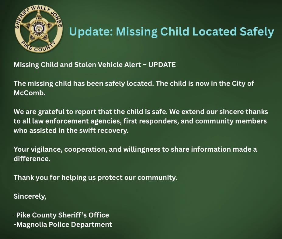 Pike County Sheriff’s Office Missing Child Located Safely Update--Tuesday, February 24, 2026